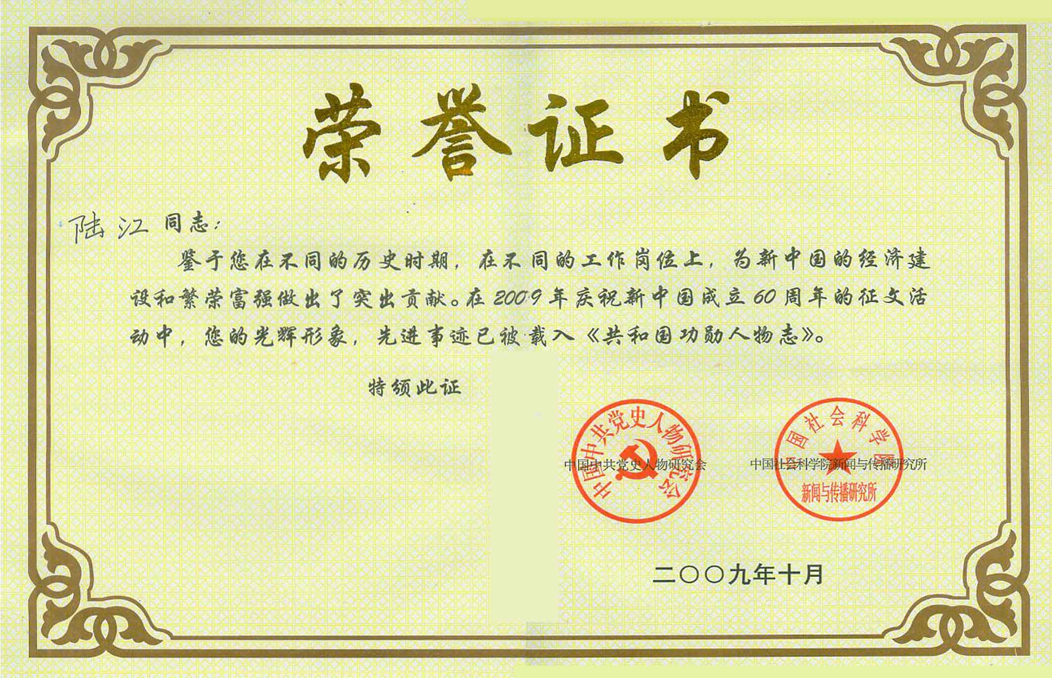陸江的論文獲一等獎榮譽證書-- 陸江論文獲創新論文獎牌